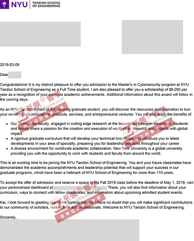 录取结果:New York University纽约大学,Master's in CS计算机硕士,奖学金 $8,000/年